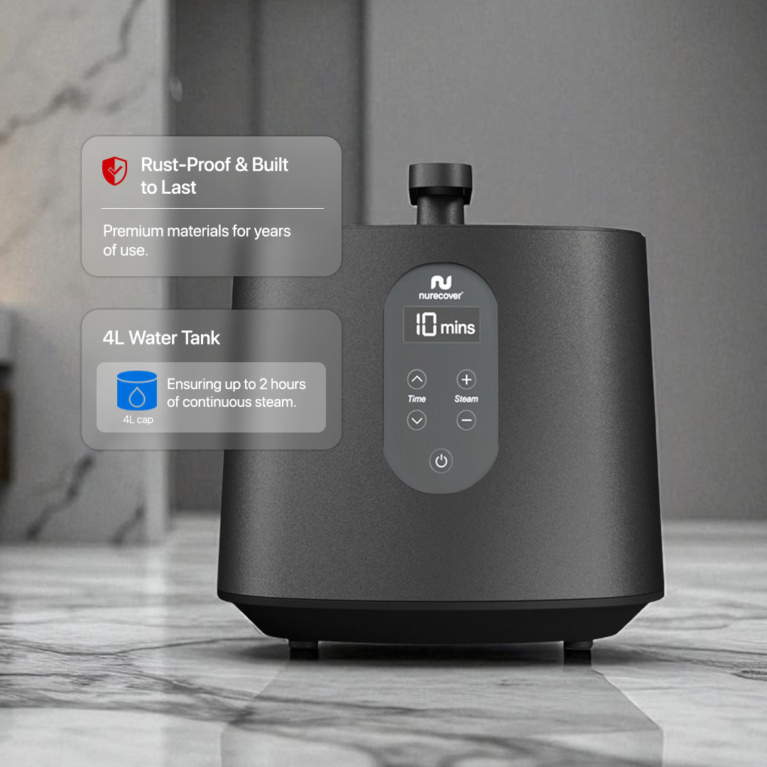 The SteamCore® works by heating water inside a secure 4L stainless-steel tank, bringing it to a boil and generating a steady flow of pure steam. That steam is then delivered safely into the sauna through a heat-resistant tube, filling the interior with deep, penetrating warmth.